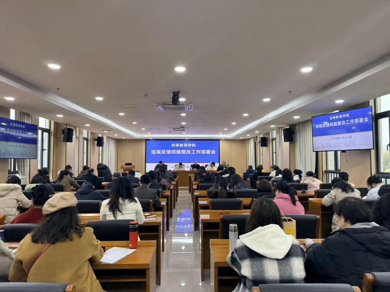 为深入贯彻落实学校党委关于省委第九轮巡视整改工作部署要求,扎实推进巡视反馈问题整改落地见效,2026年3月17日下午,初等教育学院召开巡视反馈问题整改工作部署会。学院党委书记李宣平主持会议并讲话,院长曾晓洁部署具体整改任务。全院教职工参加会议。