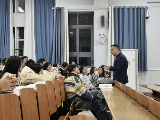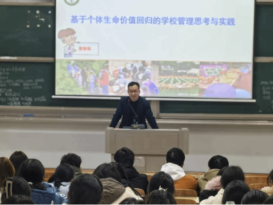 2025年12月9日晚,初等教育学院在怀中南207举办小学校长专题讲座。长沙市育英第二小学校长殷智强进行了主题为“基于个体生命价值回归的学校管理思考与实践”的专题讲座。初等教育学院邓栩老师出席并主持。2025级小教语文、数学班和2025级小教润之英才班共5个班200余名同学参与了此次讲座活动。