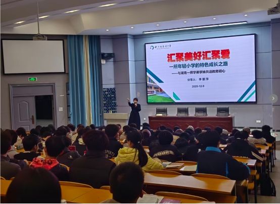 2025年12月9日晚,我校怀中南110报告厅座无虚席。长沙砂子塘嘉汇小学李丽萍校长受邀为初等教育学院2025级小学教育专业994-998五个班200余名学子带来“汇聚美好汇聚爱——一所年轻小学的特色成长之路”主题分享。初等教育学院张洪萍老师、邓栩老师出席并主持。