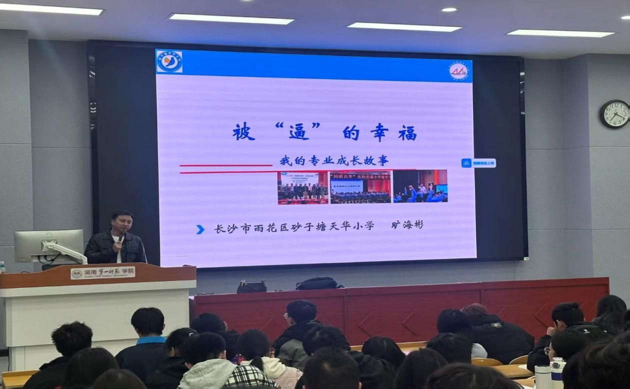 为助力学子明晰专业成长方向、汲取一线教育经验,12月16日晚,初等教育学院25级小教理科方向的200多名同学在润寰南105共同聆听了《被“逼”的幸福》专业成长分享讲座,主讲人为湖南省“双名计划”名师工作室首席名师兼长沙市小学数学教研员旷海彬老师。讲座由谢立红老师主持。