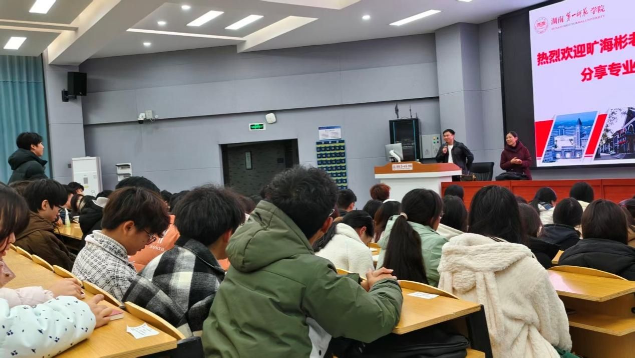 旷海彬老师首先阐释了成为教师的幸福,告诉大家选择“做什么”比“怎么做”重要。随后分享了成长路上的幸福——“逼”真的能释放人的潜能,把“不可能”变为“可能”。旷老师还结合苏霍姆林斯基“每个孩子都是一个完全特殊的、独一无二的世界”的教育理念,分享了与学生相处的感悟:优秀的学生会推动教师汲取营养、不断成长,学困生的故事更促使教师反思课堂与教育本质。讲座最后为自由提问环节,面对同学们对专业领域和生活方面的疑问,旷老师都一一用心回答。