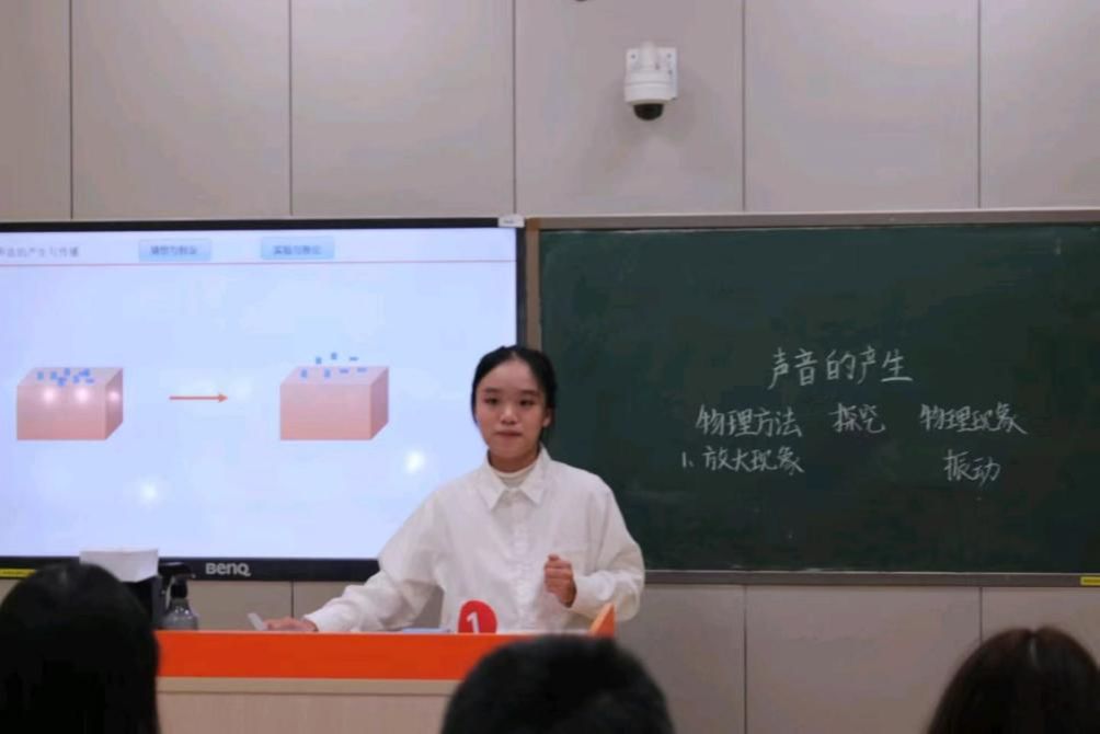 中学组的1号选手贺信柔带来的物理课《探究声音的产生》同样让人印象深刻,以严谨的教学设计和清晰的探究脉络,充分展现了以学生为主体的实验教学理念。贺信柔以“声音是如何产生的”为核心问题,引导学生经历“猜想—实验—验证”的完整科学探究过程。课堂上,她组织学生通过让A4纸发声、敲击物体等多种方式观察现象,逐步归纳出“声音由物体振动产生”的物理规律,并巧妙运用反证法,引导学生思考“振动停止,声音是否消失”,从而深化对概念的理解。整堂课以“用物理方法探究物理现象”为主线,层层推进,逻辑严密,既突出了物理学科的实证特点,又有效培养了学生的科学思维与探究能力,充分体现了教师扎实的学科素养与较高的课堂驾驭能力。