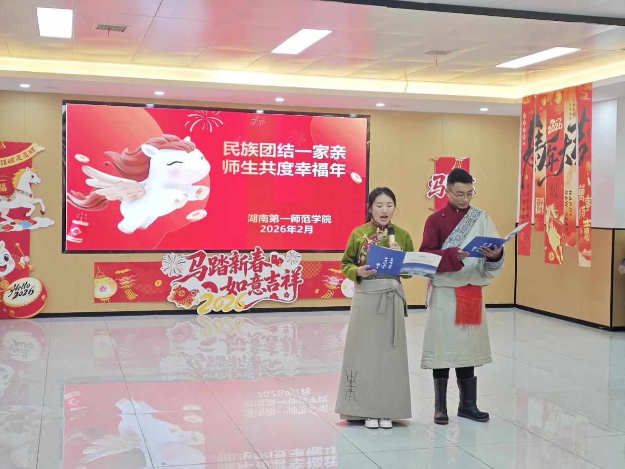 “民族团结一家亲,师生共度幸福年”联欢会在欢声笑语中拉开帷幕。西藏班学子身着绚丽民族盛装,以一段热情奔放的锅庄舞瞬间点燃全场。深情的朗诵《天路遥,湘藏情》道出了跨越山河的求学故事与湘藏情缘;独特的扎木念弹唱《卓玛仁青岗》悠扬动人,展现了雪域文化的魅力;全场共鸣的合唱《一个妈妈的女儿》,更是唱响了中华民族血脉相连、守望相助的深切情感,生动诠释了“一家亲”的温暖主题。